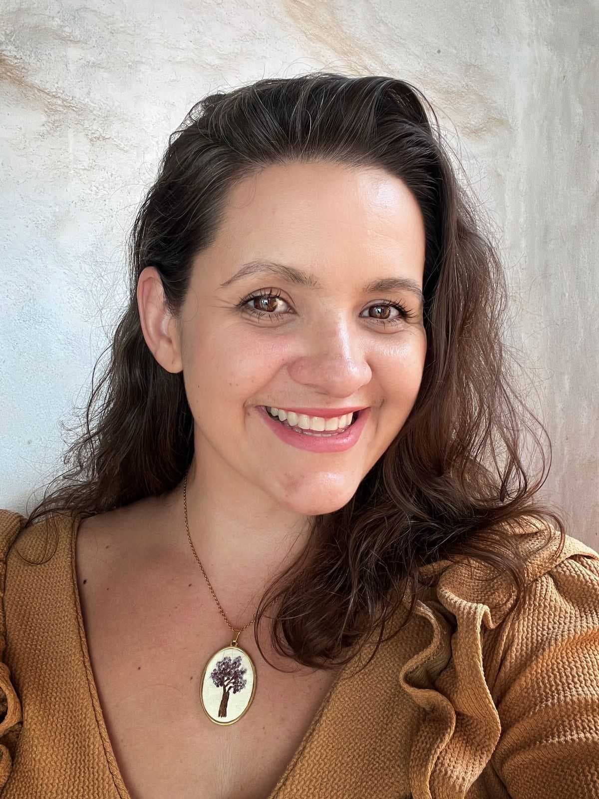 Meu nome é Aline Maria Cantagalo e eu bordo desde que tinha 9 anos de idade. Trabalhei dos 16 aos 30 anos com estamparia artesanal, desenvolvendo peças pintadas a mão para decoração, como cortinas, jogos de cama e de banho.